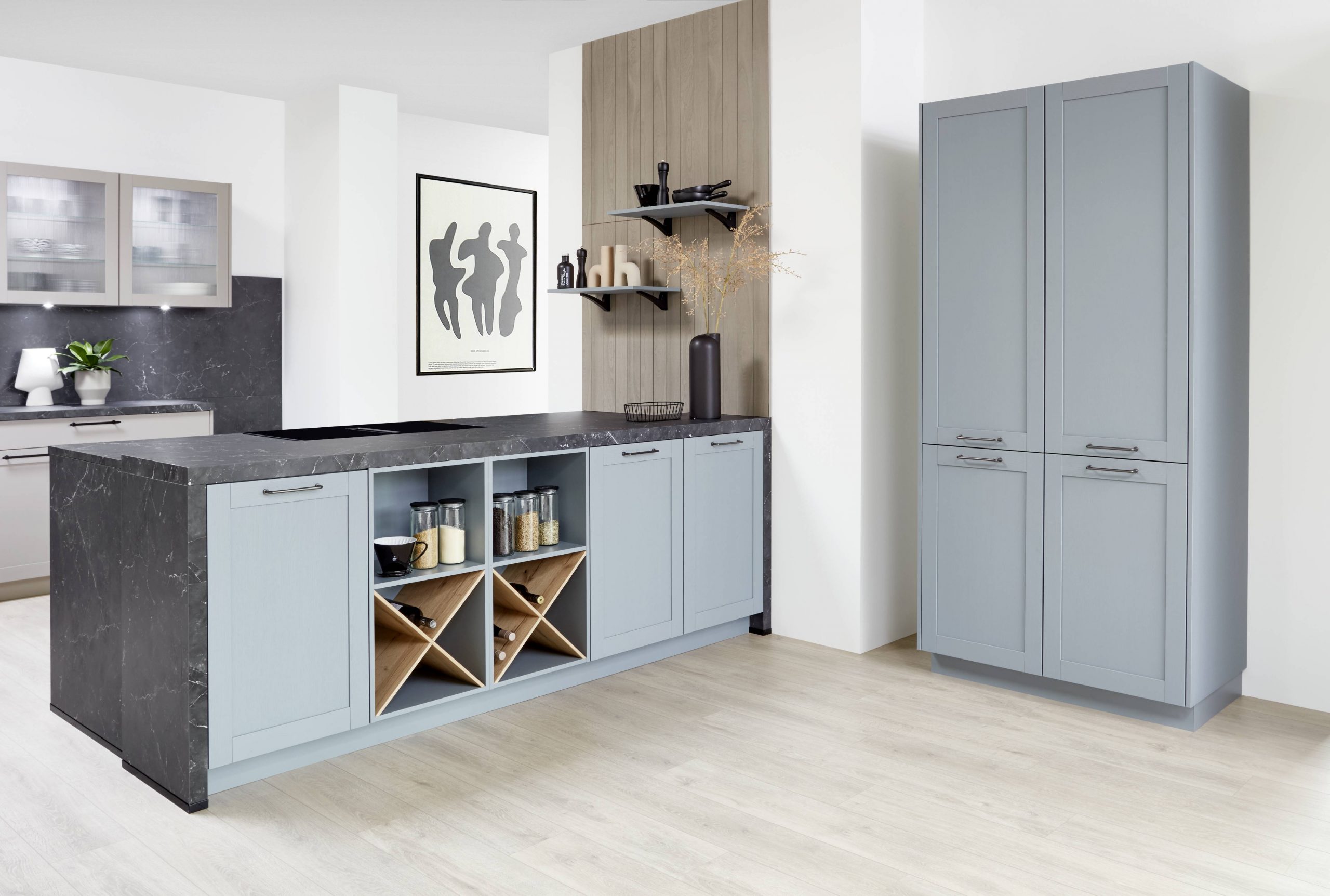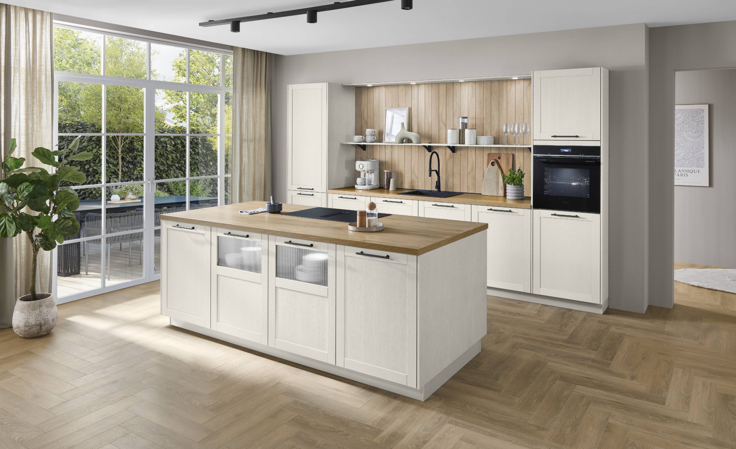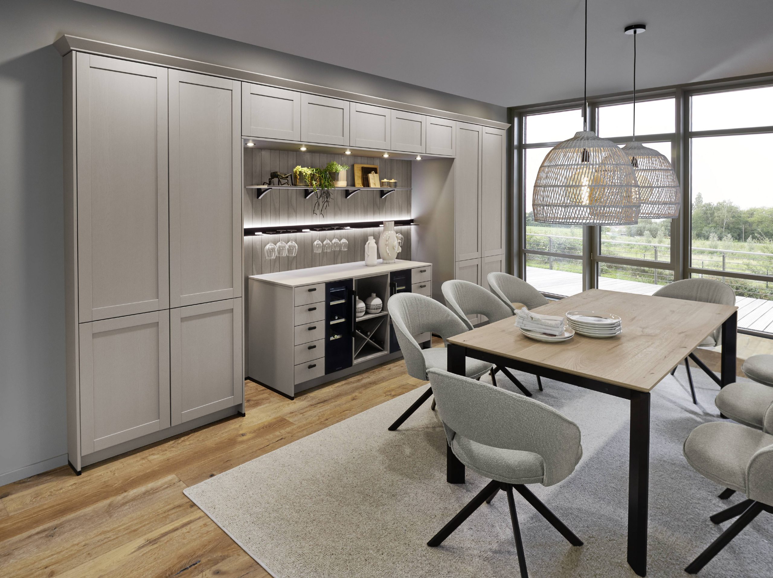 Gracias a sus estructura enmarcada laminada lacada a poro abierto, da un aspecto de Roble auténtico, diversidad en tonos RAL. combinables con variedad de formas en vitrinas y tiradores que aportan ese toque clásico que merece.